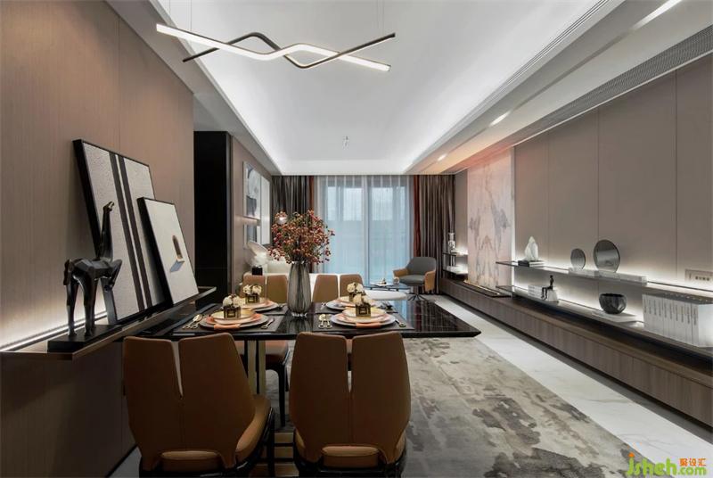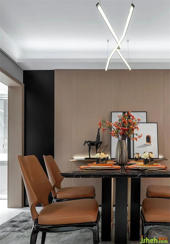 客餐廳作為家庭生活主要互動(dòng)空間,立面處理整體連貫,將玄關(guān)鞋柜、餐桌、沙發(fā)位三個(gè)功能空間整體融合在一個(gè)空間氛圍之下,以筆挺、堅(jiān)毅的風(fēng)格體現(xiàn)家庭審美格調(diào)與精神。