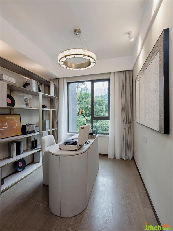 “材料的穿插,讓生活的品質(zhì)感與舒適性娓娓道來(lái)?!奔揖叩拇钆渑c墻面相互協(xié)調(diào)、水晶吊燈以及金屬元素的點(diǎn)綴,成就了書(shū)房一隅的閱讀時(shí)光。每一處設(shè)計(jì)的細(xì)節(jié)都有其特色存在,創(chuàng)造出一種輕松、隨意的生活狀態(tài)。