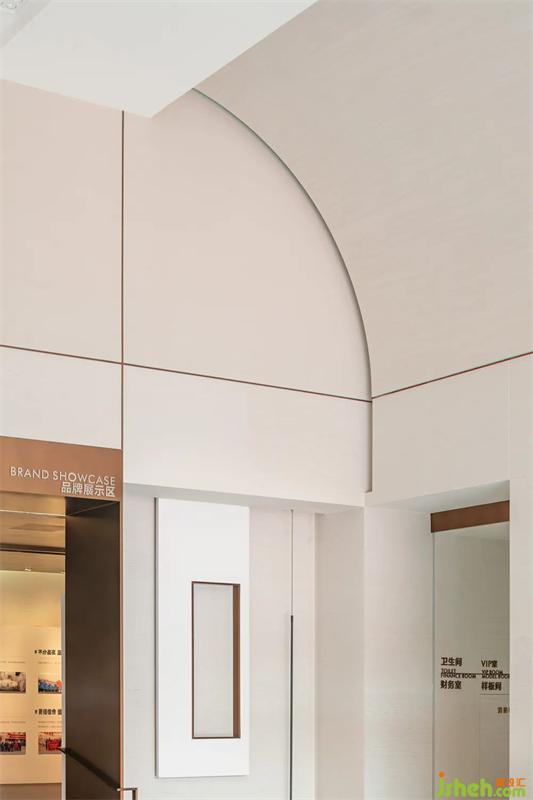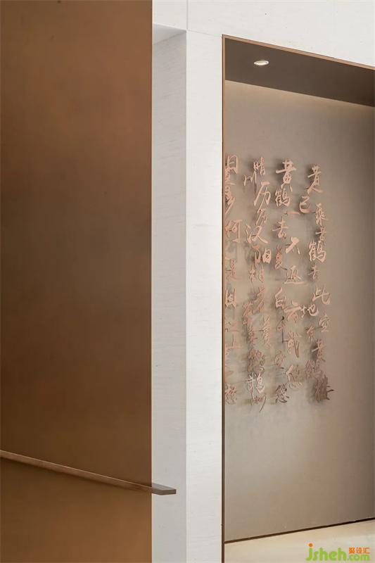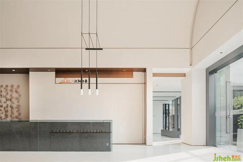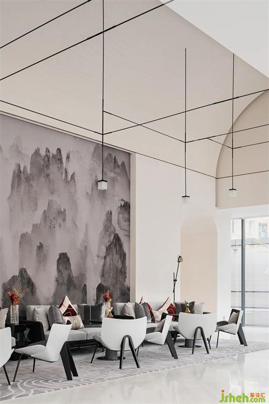 延續(xù)線條的質(zhì)感,背景輔以大型水墨畫的柔和,傳統(tǒng)與現(xiàn)代結(jié)合。重巒疊嶂,云霧繚繞,讓人們回歸自然,感受漢陽的山水之趣。