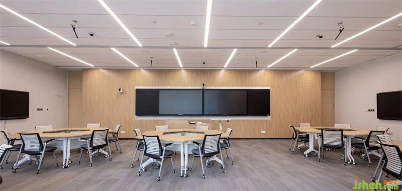 走進(jìn)智慧教室,數(shù)字化屏幕映入眼簾,組合搭配的課桌椅,使交流學(xué)習(xí)更加便捷高效。富有溫暖觸感的木飾面和地毯,提升了空間自然簡約與科技感的和諧氛圍。