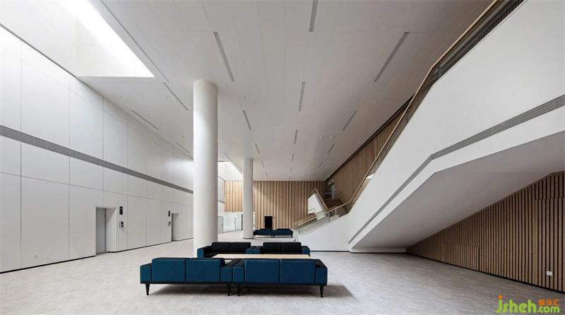 大廳空間運(yùn)用體塊組合的原則,以主背景墻為中心體塊,兩側(cè)空間體塊呼應(yīng)、延伸,形成簡潔、整體的視覺感受;頂面采用經(jīng)過詳盡計(jì)算的微孔鋁板造型,在功能和形式上都遵循統(tǒng)一的空間設(shè)計(jì)語言。