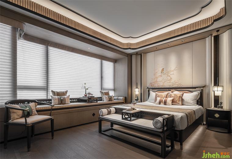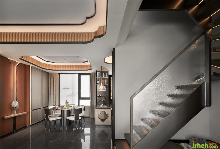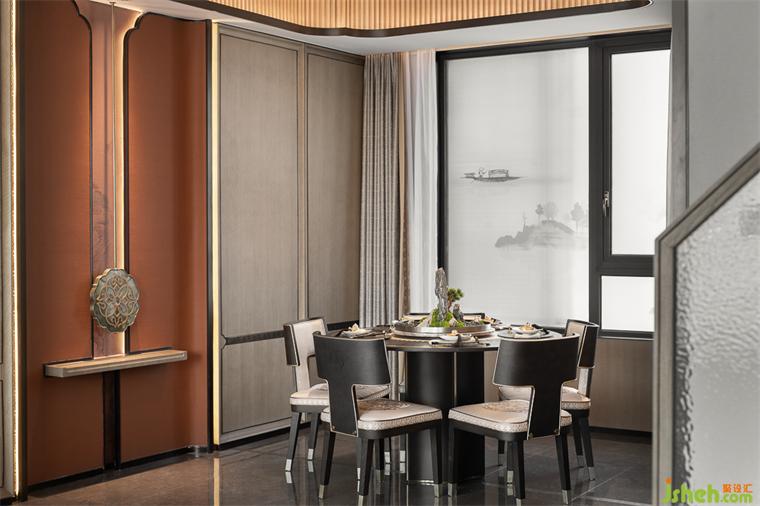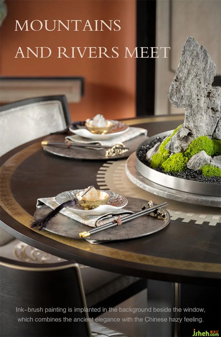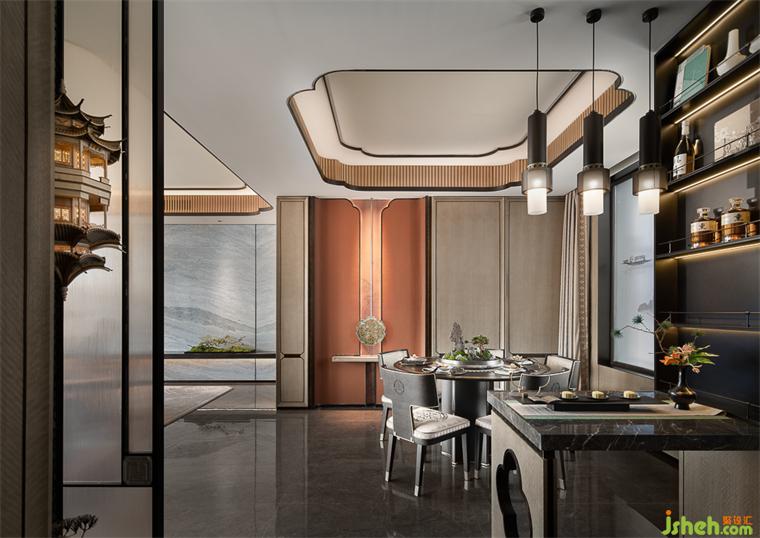 餐廳吊頂提取梅花元素,與墻頂連通形成整體,窗邊背景植入水墨畫(huà),古意雅致與中式朦朧感渾然而成。