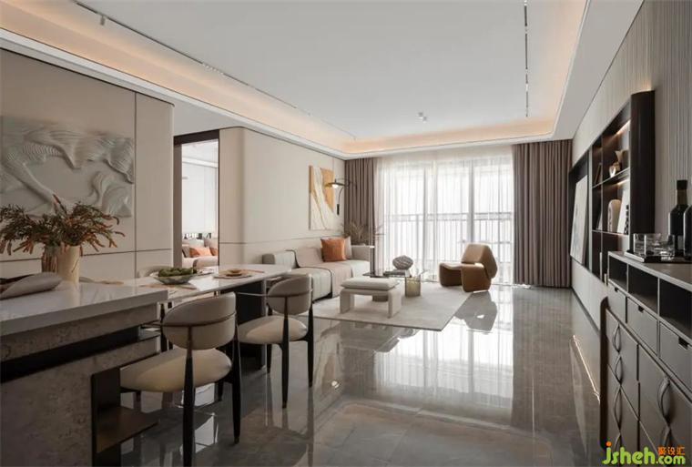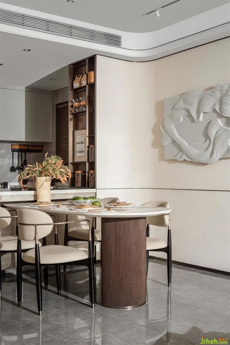 設計師弱化了很多常規(guī)的輪廓,對空間、光線和線條的處理游刃有余,在餐廳的設計上正是如此。運用曲線或弧形,讓整體空間看起來更圓潤流暢,利落的線條,清晰的空間構造,步調(diào)和諧統(tǒng)一讓餐廳與客廳巧妙地融合在一起。