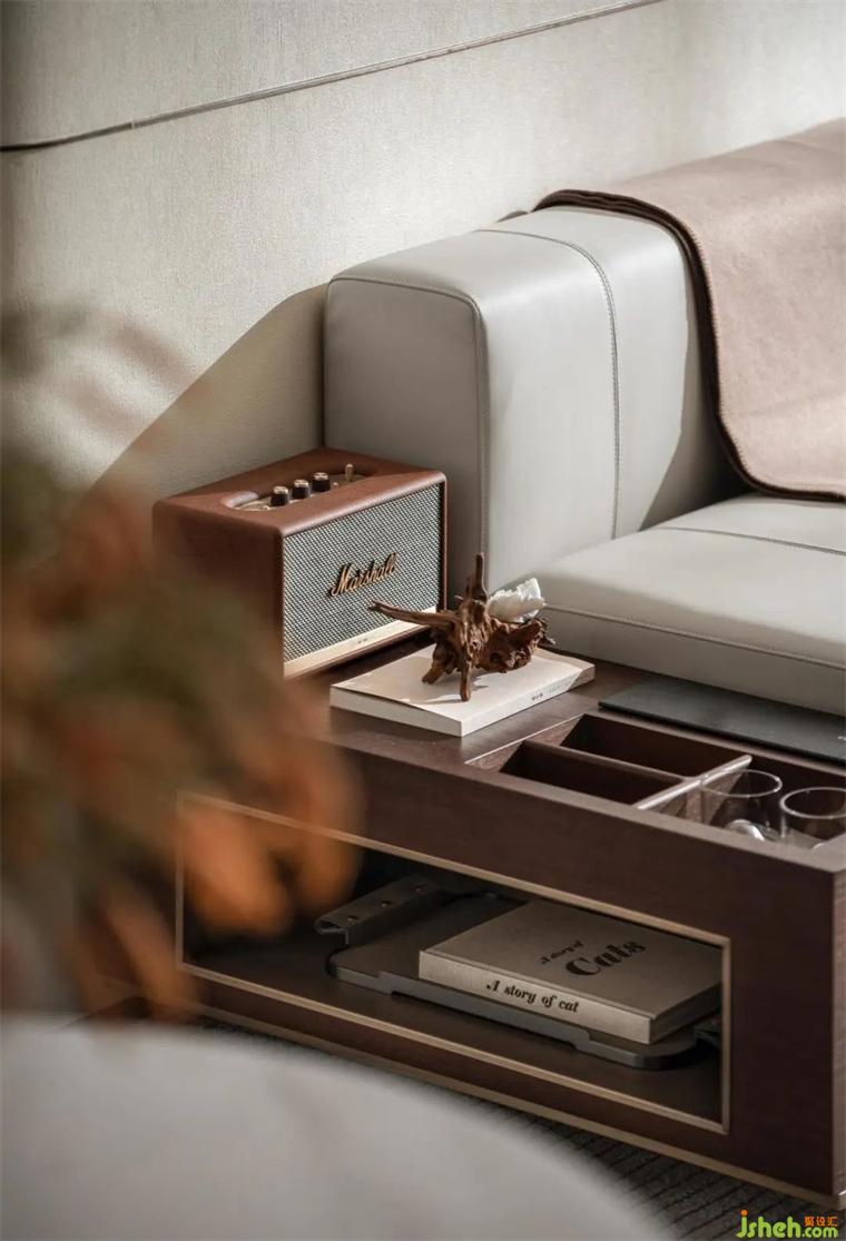 設計來源于生活,同樣,生活中不能沒有設計。靈動的空間主要靠背景墻線條多變增加空間層次感,而這些置于細密線面中的櫥窗上,展示的是同樣線條靈活的裝飾品。啞光的平滑皮沙發(fā)給整個空間增加了一絲穩(wěn)重,樣板房設計仿佛漂浮在空中的輕奶油緩緩落下。沙發(fā)上焦糖色的皮革抱枕和墻面畫上的咖色,一深一淺,一明一暗,互相呼應,層次分明,才不會造成審美疲勞,也不會讓人覺得過于單一。