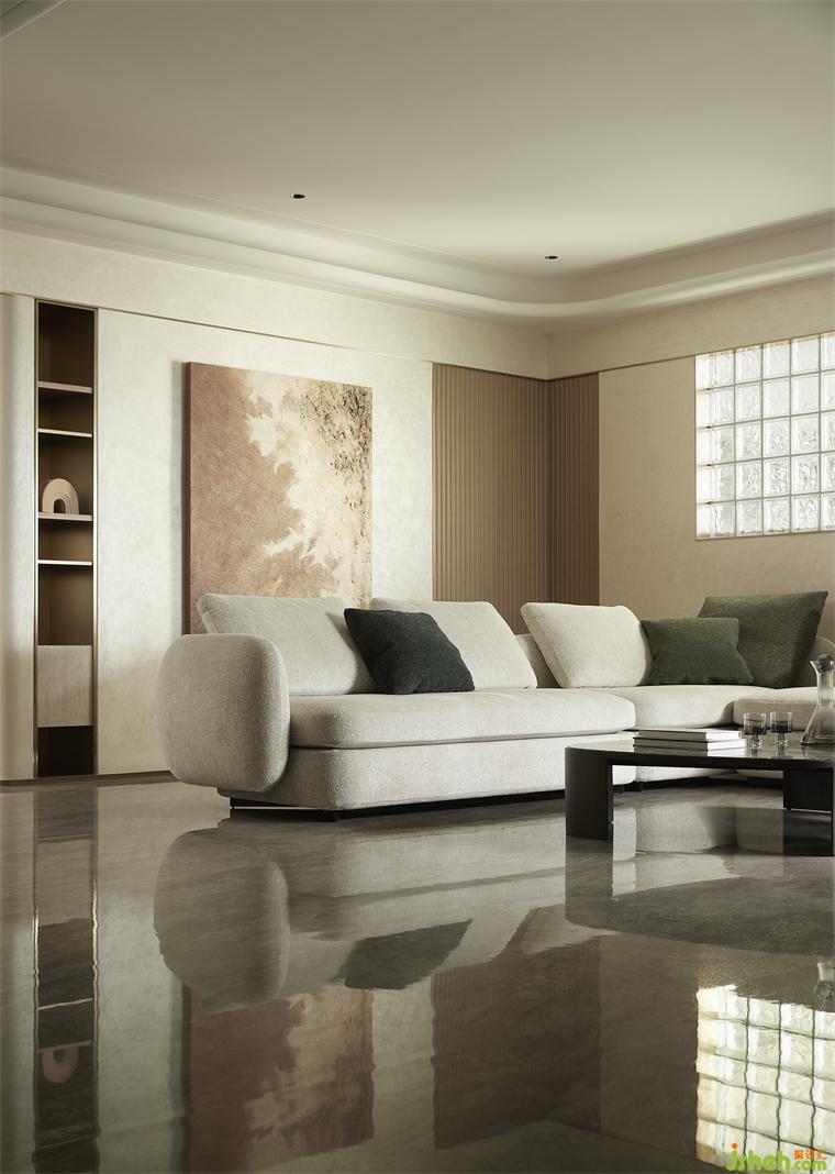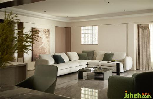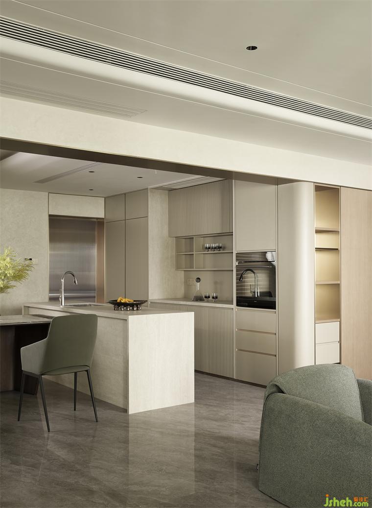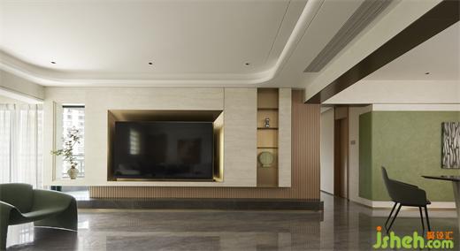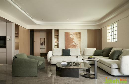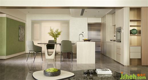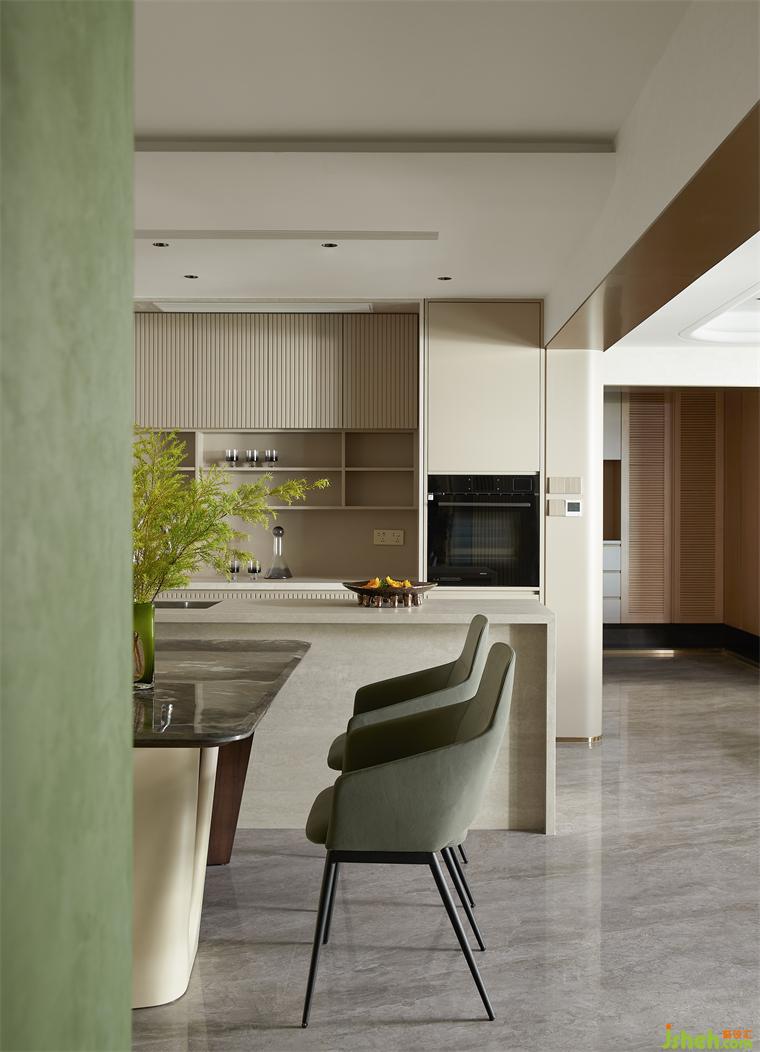 客廳沉穩(wěn)柔和的大地色系,包容著質(zhì)感、材料、光線的互動(dòng)與變化,住宅設(shè)計(jì)營(yíng)造素雅和簡(jiǎn)練的空間氣質(zhì)?;【€感的家具與建筑外窗呼應(yīng)成一體,跳躍的綠色藝術(shù)掛畫(huà)與橙色抱枕巧妙地打破了空間的沉悶感。在這個(gè)現(xiàn)代主義的時(shí)尚空間里,勾勒出溫婉親密的格調(diào)。