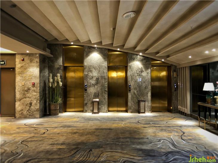禧合酒店是一家主要承接喜宴及會(huì)議的主題式宴會(huì)酒店,本案位于哈爾濱南崗區(qū),主體為一家洗浴中心五樓的加建鋼結(jié)構(gòu)部分。在建筑結(jié)構(gòu)上室內(nèi)地面有2米左右的錯(cuò)層,屋頂為鋼結(jié)構(gòu)尖頂,中間最高處舉架為5米多,最低點(diǎn)的天花高度為2.3米。綜合空間本身?xiàng)l件,設(shè)計(jì)團(tuán)隊(duì)希望通過(guò)多變的設(shè)計(jì)手法讓空間環(huán)境給使用者一種“沉浸式”的體驗(yàn)感??腿私?jīng)過(guò)一樓接待區(qū),乘電梯直達(dá)五樓,映入眼簾的是無(wú)邊的星空,天花巧妙的燈光布置,無(wú)數(shù)的燈珠似繁星懸垂于上空,映照滿堂閃爍的光影。漫天晶瑩似乎觸手可及。寬敞的走廊既有利于宴會(huì)廳分流,也給后期運(yùn)營(yíng)提供了布場(chǎng)空間。