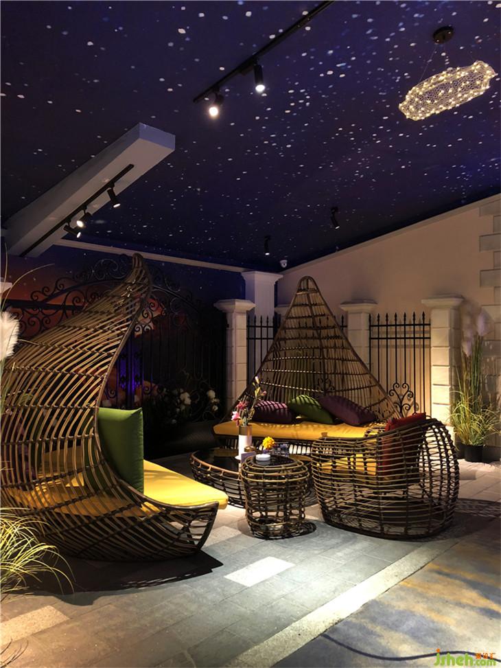 當(dāng)音樂響起,遠(yuǎn)處的海景房、海浪拍打沙灘、漸變的藍(lán)色燈光撲面而來(lái),墻面自然色以及棚頂植物的綠色,同時(shí)也緩和了空間,突出造型結(jié)構(gòu)特點(diǎn)。桌椅選用白色,富有親和力,也使空間更為純凈。