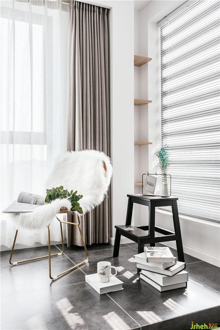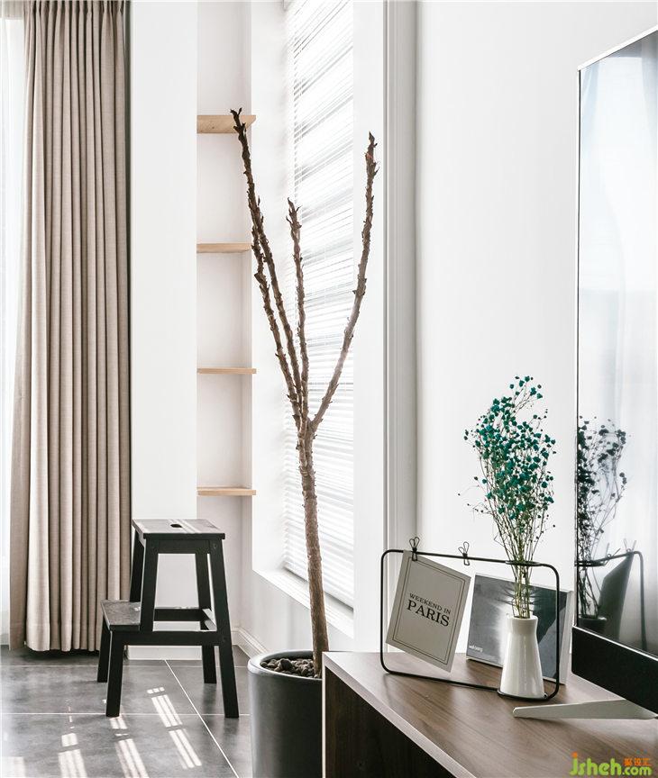 透過客廳陽臺的窗戶,陽光傾灑入室,灰白色木地板完美承接了大自然的過渡,這是打通陽臺與客廳的好處,增大了采光,也開闊了視野。
