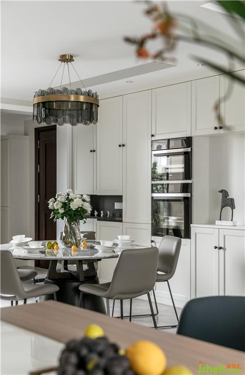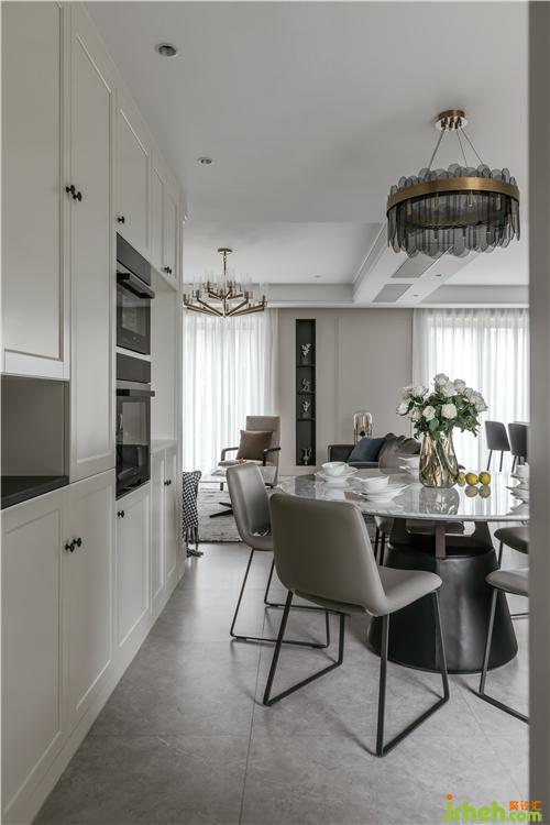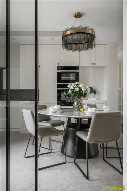 裝修設(shè)計上我們保留了原建筑房型橫廳的效果,在原有餐廳位置我們把島臺和餐桌換了個,這也是出于業(yè)主一家生活方式的考慮。雪花白大理石的圓桌簡潔的結(jié)構(gòu)和入門西廚柜相得益彰,在儲物功能的基礎(chǔ)上植入黑色凝練空間的元素,顯得更加沉穩(wěn),頂部空間銅色和灰玻的映襯下讓空間更加飽滿富有質(zhì)感。