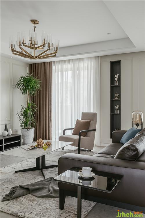 在屋內(nèi)的色彩選擇上依托了家具的皮質(zhì)顏色,裝修設(shè)計運用了中性色,背景的線條和懸浮的金屬掛件在燈光的映襯下為空間注入了一絲味。