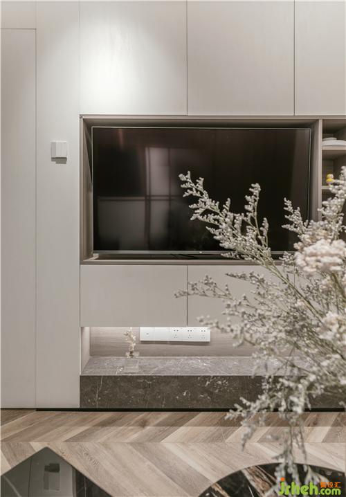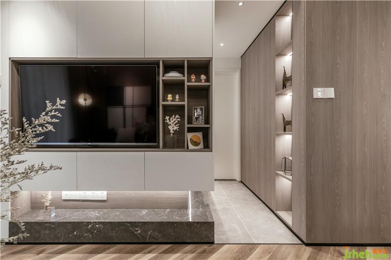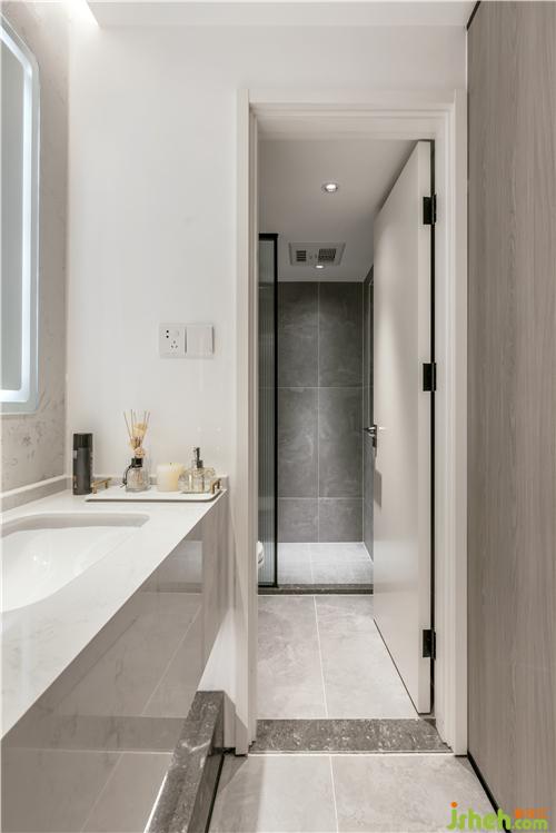 主臥隱形門和電視柜統(tǒng)一整體,有開有合的柜子以及灰色大理石延伸到衛(wèi)生間,不僅增加儲物和使用功能的便捷,還有視覺上的美感提升。