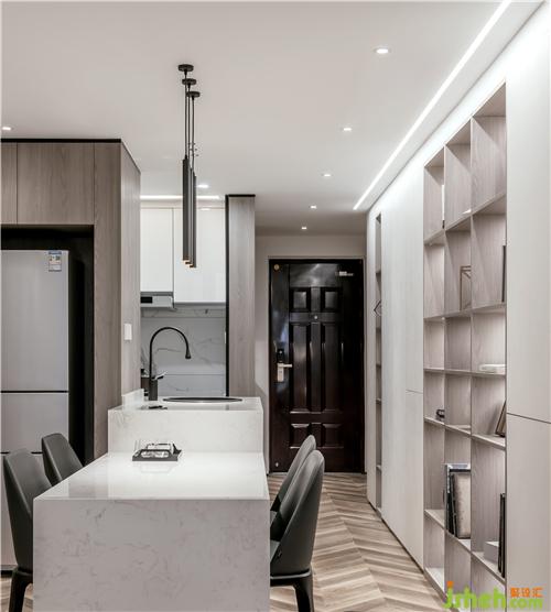 烹飪空間與吧臺區(qū)形成洄游動線,打破傳統(tǒng)設計,便于屋主進行起居生活操作;流動、溫馨的空間關系,方便美食前的交流與互動;整體干凈利落的線條引導視覺走向,裝修提升居家幸福感。