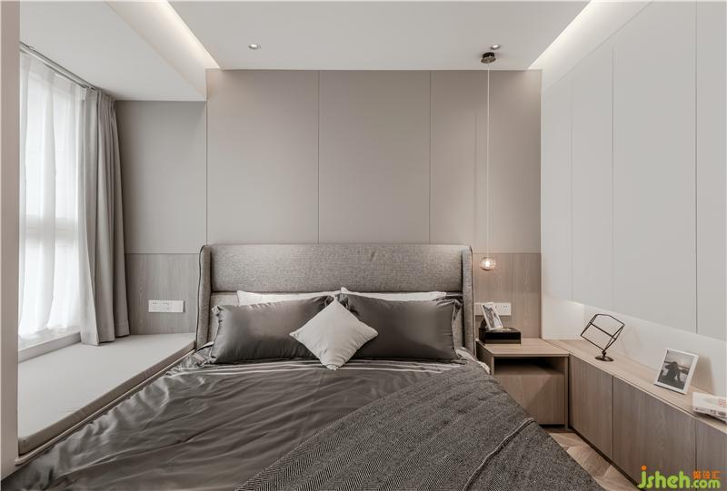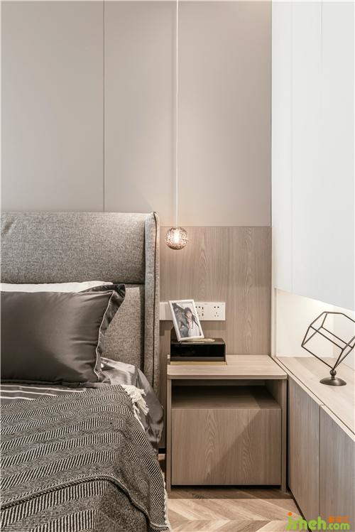 主臥室灰色硬包與木掛板相得益彰,有節(jié)制的灰調凝練出的溫和承載屋主揮斥方遒背后的疲憊