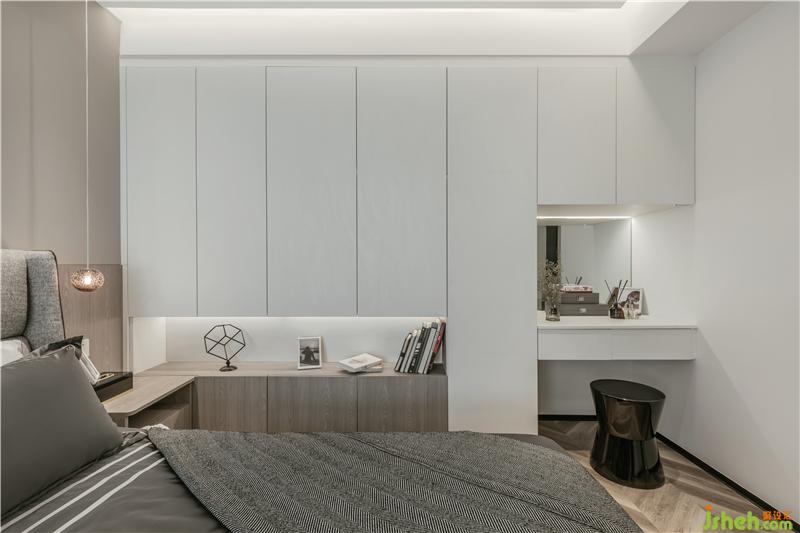 你是否有在臥室缺少一個自己的化妝臺或者書桌的煩惱,但是設置在床頭又不夠美觀,床尾又擔心突出來撞角。我們利用柜子的深度將書桌設置其中,美觀又節(jié)省空間。且柜子的開放空間和床頭柜做一整體,不僅在空間感上有所增增加,在視覺美感上也得到了提升。