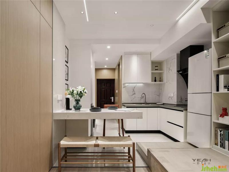 餐廳的設計上我們采用的是石材,從餐桌一直延伸到臺面高低錯落滿足大人和小朋友同時就餐。同時地面,墻面,頂面 我們?nèi)坎捎冒咨浜蠠艄庠O計提亮整個室內(nèi)設計師空間。