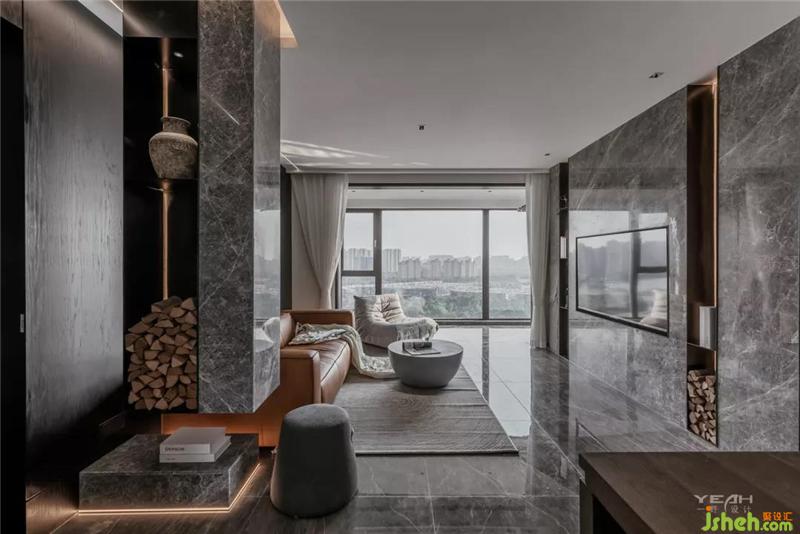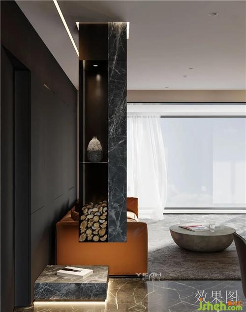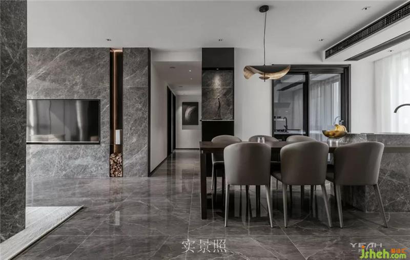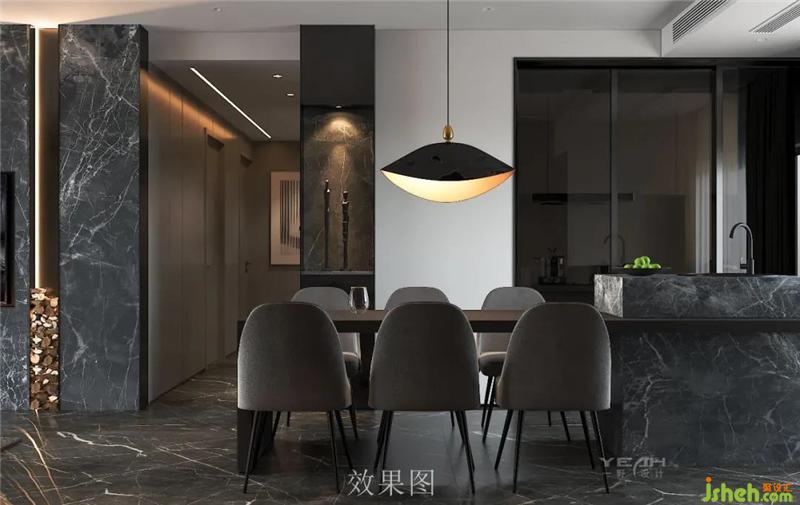 客餐廳的大理石,木飾面及黑鋼與燈帶,室內(nèi)設(shè)計(jì)師通過不同造型組合,讓材料有不同的構(gòu)架,燈線穿透 ,空間放大的體驗(yàn)。