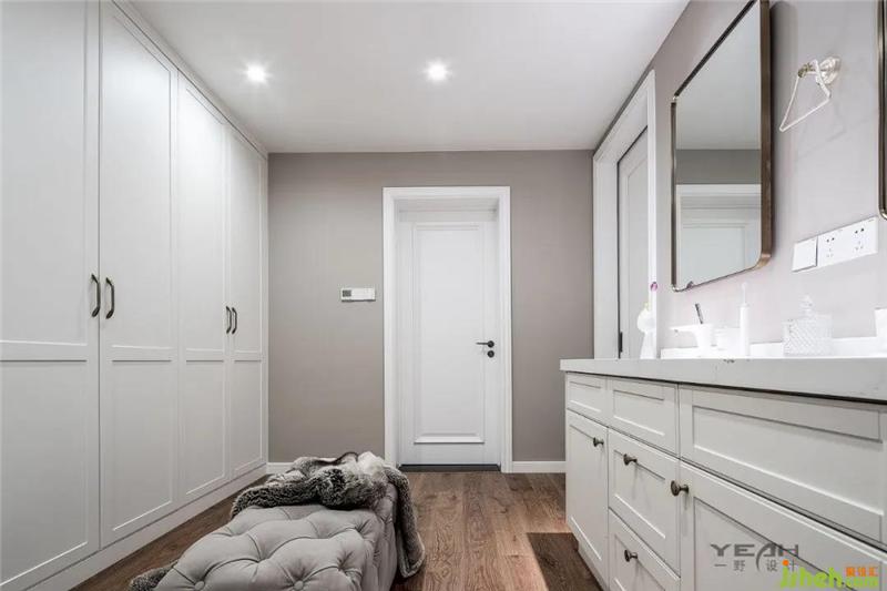 業(yè)主并不追求過大的衣帽間,將適當(dāng)?shù)膬ξ锟臻g讓給雙臺盆,室內(nèi)設(shè)計師讓兩個空間同時掙脫功能束縛,變得寬敞宜人。