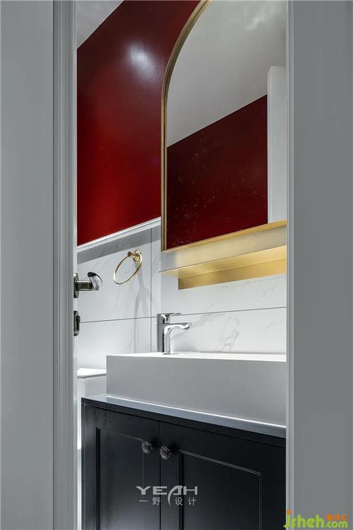 紅色的半墻和黃銅鏡子極具設(shè)計感,室內(nèi)設(shè)計師復(fù)古華麗,讓空間眼前一亮。