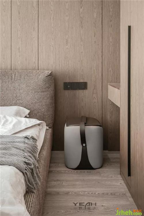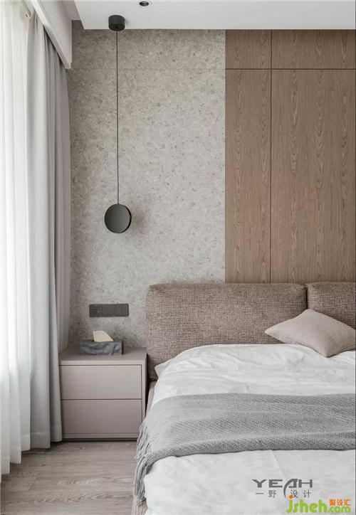 主臥室選用水磨石板與木飾面結(jié)合,在溫和的空間注入一絲硬朗。沒有啰里啰嗦的給空間過多的裝飾,把公共空間的度在臥室得到有效的銜接。