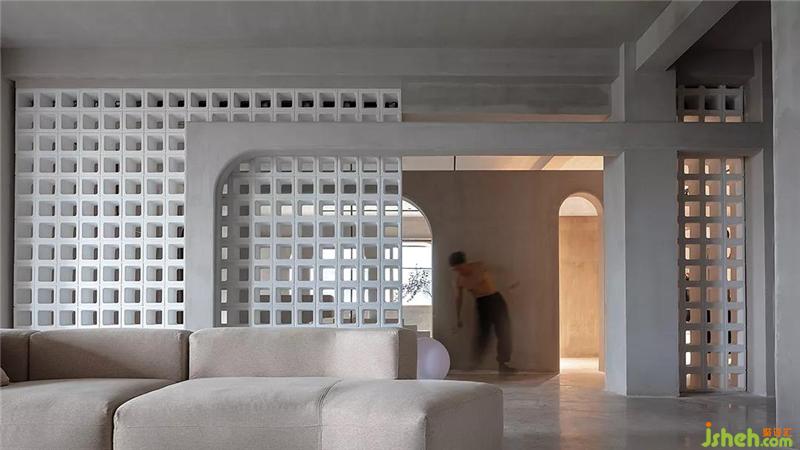 整個600平的空間分割成大回字形,兩邊的過道光線比較弱,便采用了空心磚作為半隔斷形式,將光線偷進來的同時,還要為它塑形。解決暗部問題也增加了空間體驗感。