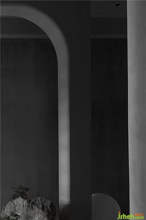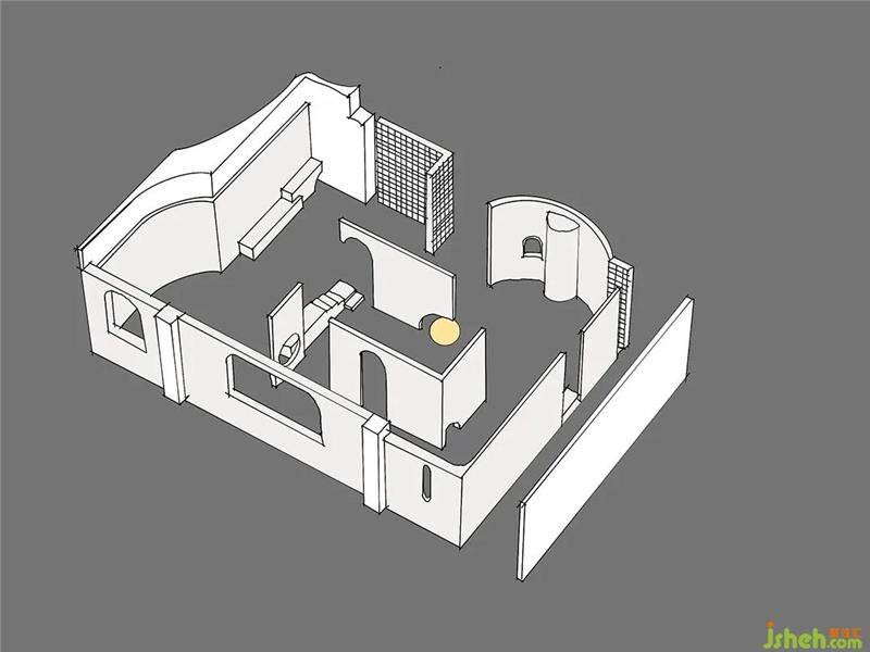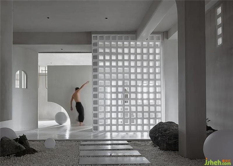 The two exhibition spaces use arrayed space bricks as semi-partitions to successfully introduce the north and south light sources into the room, and the arc-shaped lines are all cut from the surface.