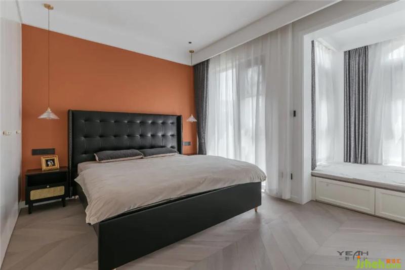 橙色的熱情與溫暖同樣在臥室里得到不同的呈現(xiàn),保證視覺的連續(xù)性??臻g拋棄了一切復(fù)雜的設(shè)計技法,蘇州室內(nèi)設(shè)計師用大面積的空白給生活留足發(fā)揮的空間,塑造平靜的休息空間。
