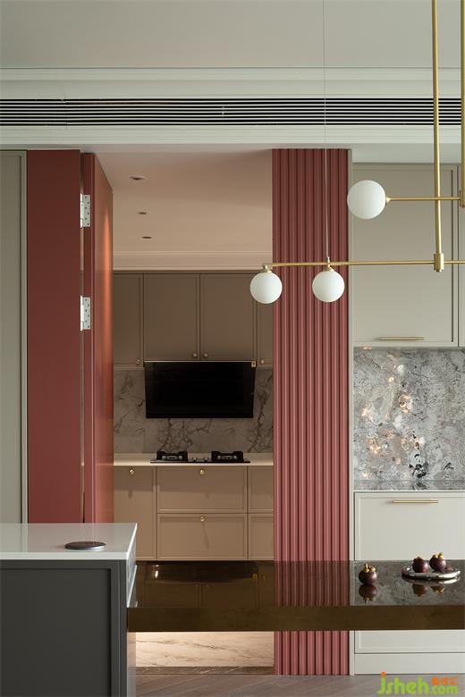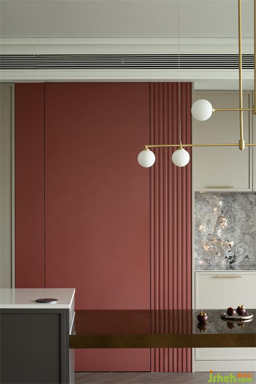 廚房門(mén)與木飾面渾然一體,與格柵形成豐富的層次遞進(jìn),美得渾然天成。蘇州大平層設(shè)計(jì)濃郁的磚紅讓它從素雅的空間里脫穎而出,讓熱情化為形體,表達(dá)空間所蘊(yùn)含的生活態(tài)度。