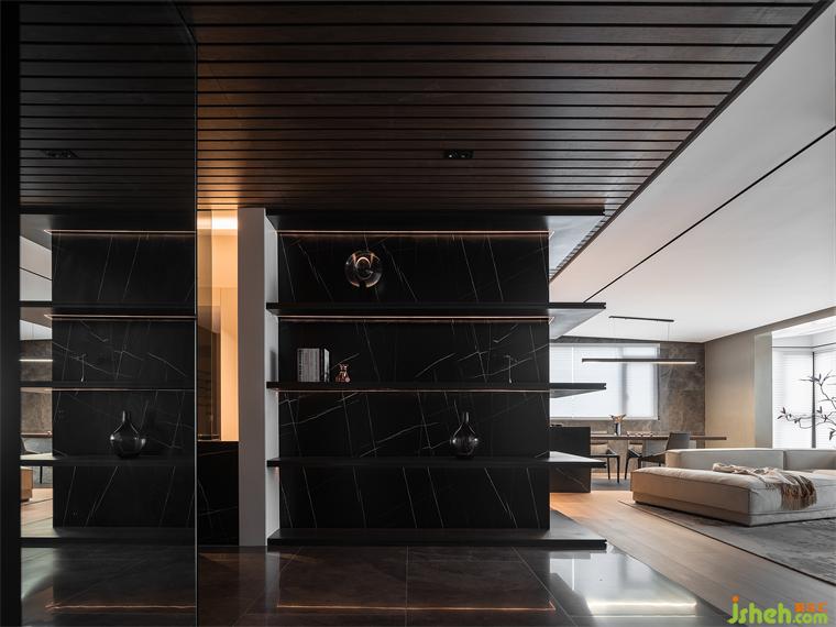 明與暗,黑與白,涇渭分明的對比帶來視覺張力,在入戶的剎那撲面而來,宣告屋主與眾不同的品味,和對生活獨特的理解。貴陽豪宅設(shè)計穿衣鏡與墻面融合,映照室內(nèi),延展空間的寬度,讓人在虛實之間享受無盡空間感帶來的舒適體驗。