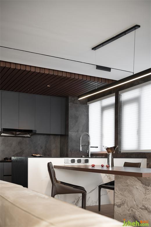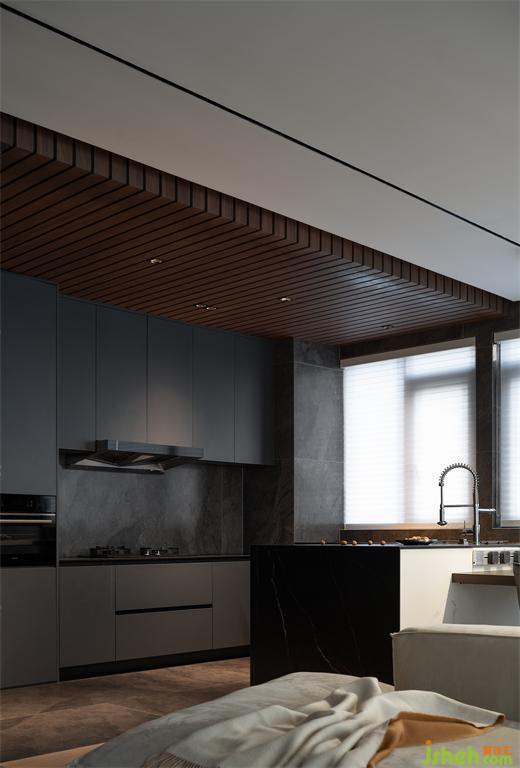 開放的公共空間讓一家人的聯(lián)系更緊密,依據(jù)功能屬性則設(shè)計有所區(qū)別。木飾面吊頂在空間畫出一道涇渭分明的線,貴陽豪宅設(shè)計將烹飪區(qū)與用餐區(qū)分隔開來。深色調(diào)與石材結(jié)合,彰顯質(zhì)感的同時,蘊(yùn)藏日常生活的智慧,讓清潔工作更簡單便捷。
