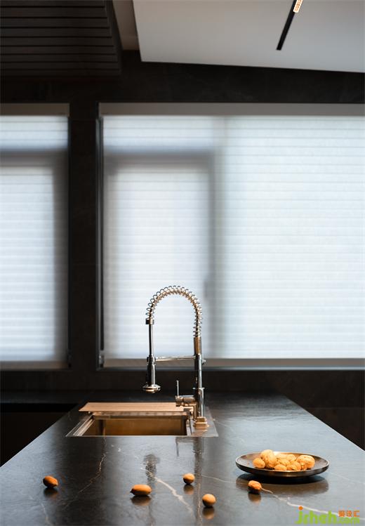 操作臺、島臺、餐桌形成一條連貫流暢的動線,一面是功能的鏈接,一面是視覺的延展,生活和美學(xué)融為一體。