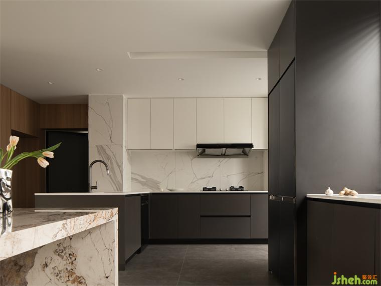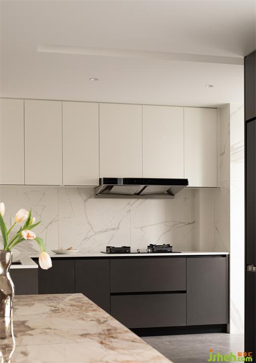 空氣里糅合了愛與快樂的味道,恰是獨屬于家的煙火氣。家裝設計大理石的紋理自然而舒展,過渡了黑與白的碰撞,視線所及之處的空間更為分明,于無形中交織出深層的醇厚氣質(zhì)。柜門的無把手設計,增強空間的整體感,簡潔干凈的線條減輕視覺負擔。