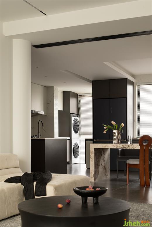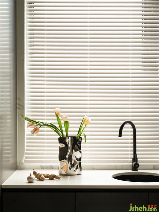 家裝設計打破常規(guī)的開放式設計,將各個功能區(qū)自然銜接,消弭空間的邊界感,保證動線的自由流暢,讓日常生活更為便捷。島臺上盛放著一日三餐的煙火人間,不規(guī)則的金屬花瓶和幾束郁金香使空間的藝術感更為強烈。