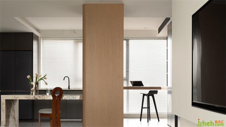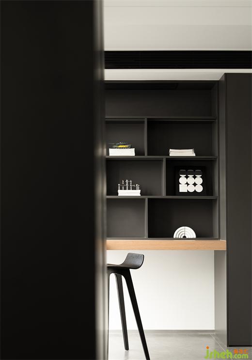 開辟一片靜謐的場域,讓生活回歸愜意與人文。懸挑的L型桌面與深色展示柜接壤,強化空間的結構感。此處是閑暇時消磨時光的好去處,也是日常辦公的絕佳場所。