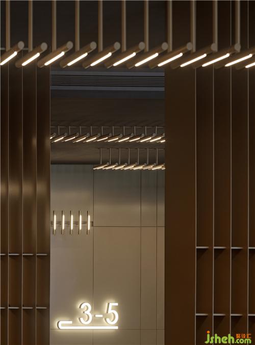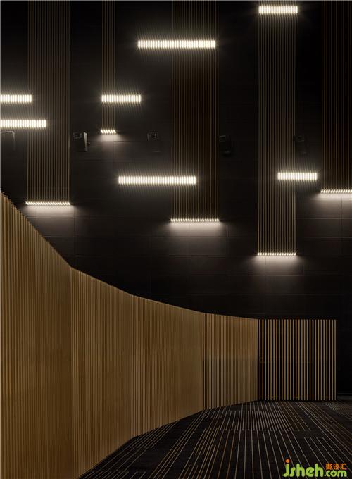 影廳的通道中,室內設計師將琴弦的概念延伸進來,天花上的燈具和地面的拼花,也圍繞著“琴弦”的設計展開,隨處可見的“琴弦”一樣的壁燈和天花燈在走道中延伸開來。巨幕影廳中的設計尤為壯觀,大空間中,從天花延伸下來的“琴弦”,以不同高度的排列在一起,連接著地毯的圖案。并且設計師將傳統(tǒng)的護欄造型改造得更加巧妙,好似琴弦排列開來,同時也注重到護欄的安全性能。以此來體現(xiàn)該影城的獨特電影院設計之處。