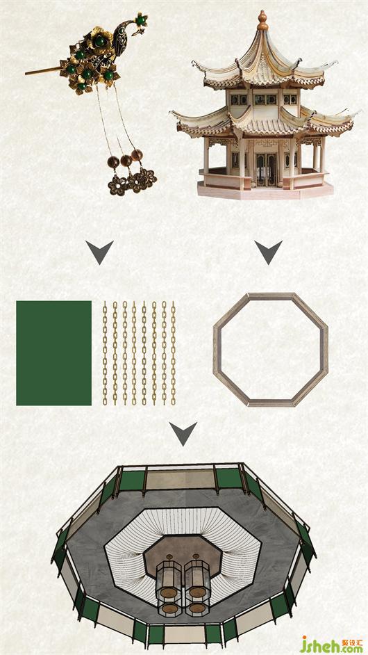 “一簪二釵三步搖”,發(fā)釵不僅是裝飾物,更是一種寄情的物品。從金釵中提取元素,將情感寄托于其中,好像回到了過(guò)去那個(gè)物華天寶的金陵城。