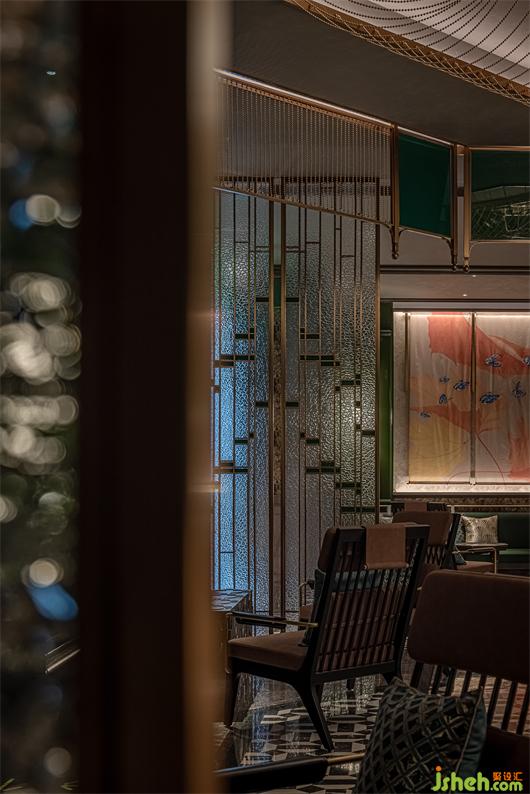 蝴蝶刺繡畫的卷軸裝置,蝴蝶標本的畫框,好像隨時都有蝴蝶飛出翩翩飛起舞;展開的折扇,吊掛的毛筆,仿佛時刻有文人墨客緩緩走來;顏色跳脫的花藝,為暗沉的空間增添一分亮色;鏡面裝置增加互動的同時,也起到延伸視覺的效果。