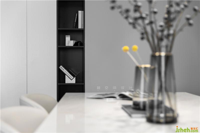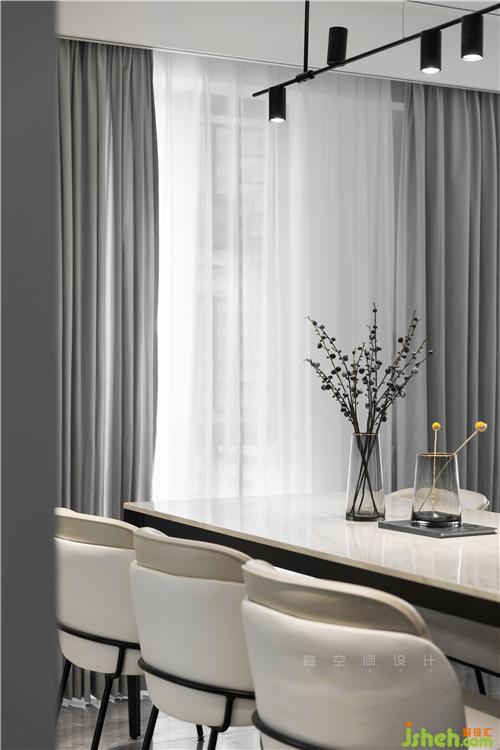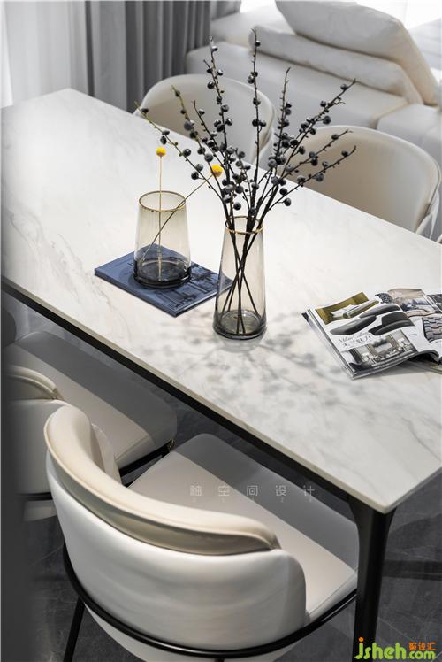 明澈清麗的大理石墻面、澄亮素凈的玻璃推門、軟糯溫潤(rùn)的餐桌椅和臺(tái)面,一如美人白皙的凝脂肌膚,端得是那樣熠熠生輝、讓人心生憐愛,僅僅是寥寥數(shù)枝淡花,也襯出了空間絕色的非凡氣質(zhì)。