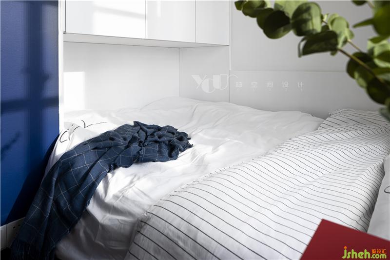 柜子、床頭延續(xù)了外廳的紅藍(lán)配色,但比例不大,整體的軟飾還是以素雅為主,更多的考慮了主臥室的睡眠功能,擔(dān)心大面色塊影響到入眠情緒。
