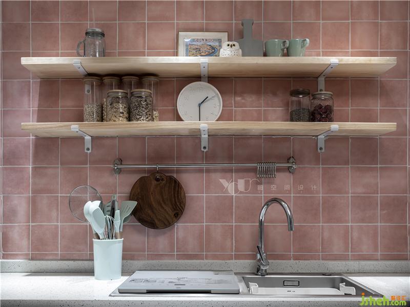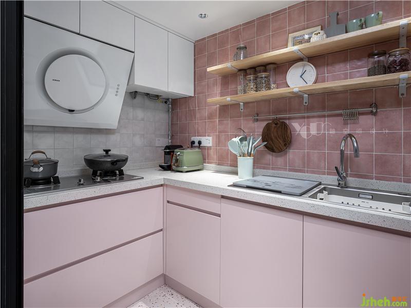 浪漫滿屋本屋了——粉色的面包磚與柜門,水磨石的臺(tái)面和地面,同質(zhì)的夢(mèng)幻氣息在延續(xù)。擱板、臺(tái)面上放置的粉嫩物件器皿,在燈光的照耀下,愈發(fā)可愛迷人。