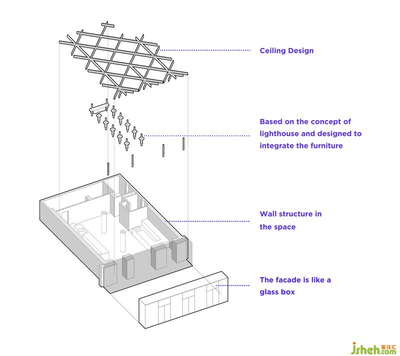 燈柱隨著時間緩慢的變暗又逐漸亮起,以此重現(xiàn)燈塔的閃爍周期。人們可以透過入口前廳的玻璃盒子,看到店內的燈柱緩慢的明暗交替,結合自然光線的變化,空間由早至晚呈現(xiàn)著不同的迷人表情。店鋪裝修