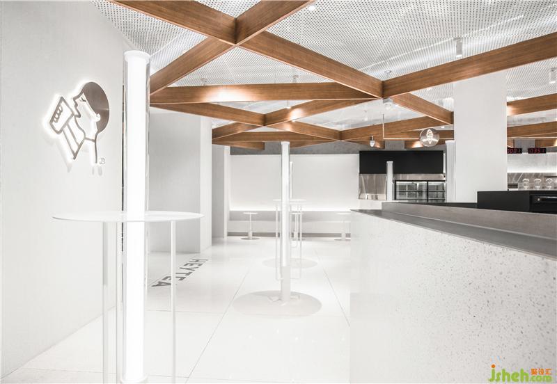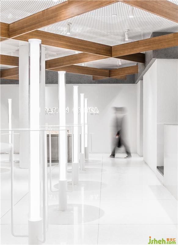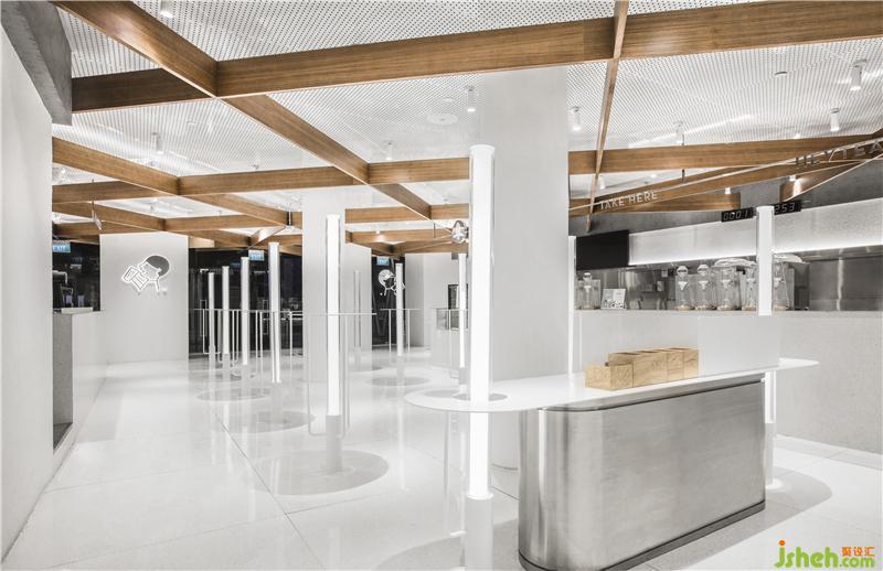 The light belts hidden wooden frame in the ceiling produce the diffused reflection to create the soft illumination and atmosphere for the interior, with the spotlights as a visual partition to divide the seating areas and passages.