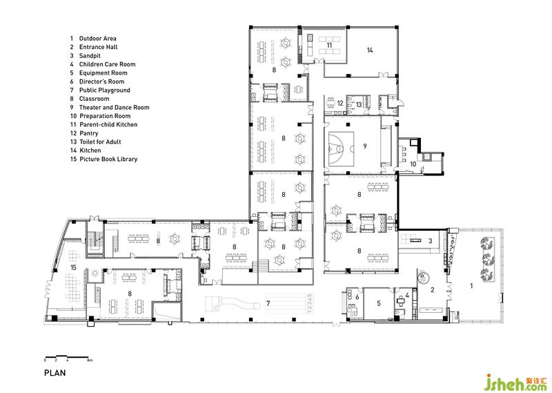 前廳是是每個孩子每天在進入這幢建筑之后的必經之路,我們希望除了接待功能之外,前廳也是一個有趣的、有活力的的空間,因此沙池被安排到該區(qū)域靠窗的位置,讓孩子可以陽光中活動。裝修公司