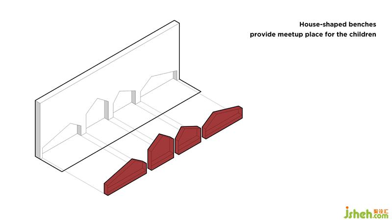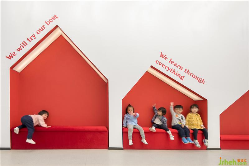 The 3-6 years old children usually convert what they see into simple symbols and it is the way they explore and learn about the environment. Therefore, the house-shaped benches have been cut into the sides of the room to bring out the simplicity and vitality.