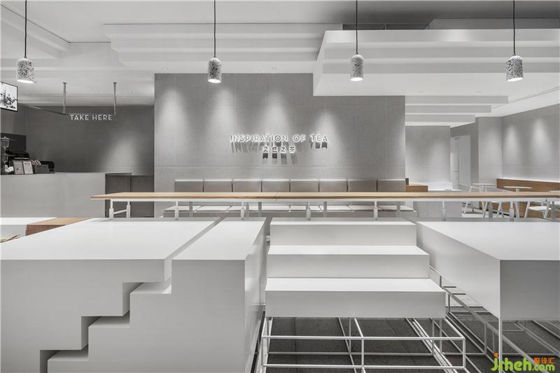 設(shè)計(jì)構(gòu)想來源于《紀(jì)念碑谷》中縱橫交錯的空間形態(tài),以打散重組在空間中的臺階做為概念的表現(xiàn)形式,錯落有致的體塊結(jié)合臺階形態(tài),自上而下延伸至整個空間。在材質(zhì)及造型上,為緩解小空間固有的壓迫感,使用白色基調(diào)和方正的體塊拓展空間界面。奶茶店設(shè)計(jì)