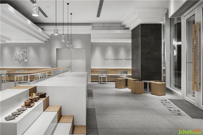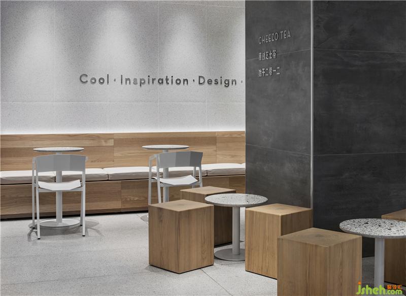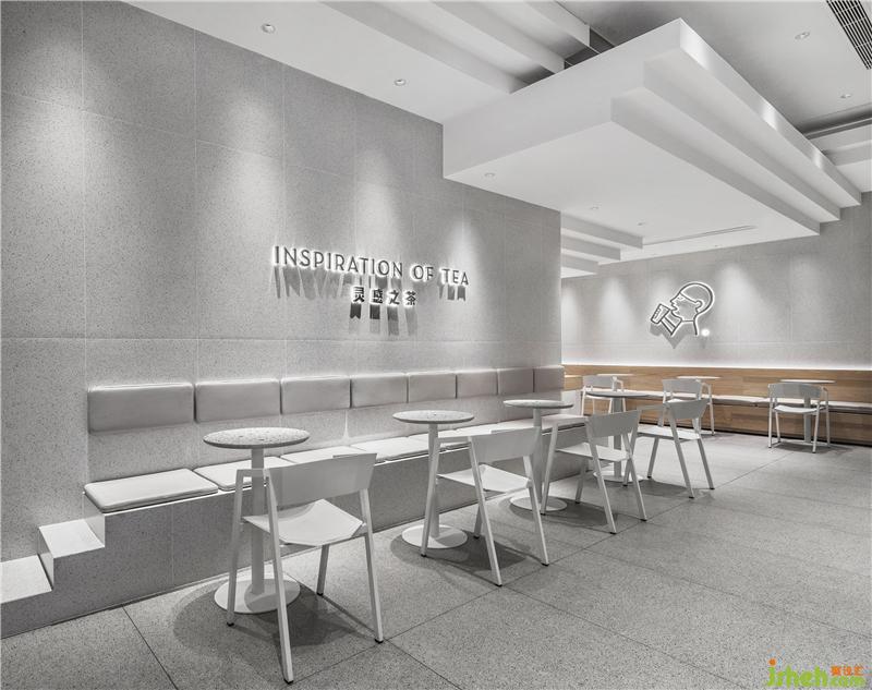 從室外看向室內(nèi),虛實(shí)交錯的體塊造型鋪滿空間,中島組合成陣列分布,形成了張弛有度的友好姿態(tài)。奶茶店設(shè)計(jì)