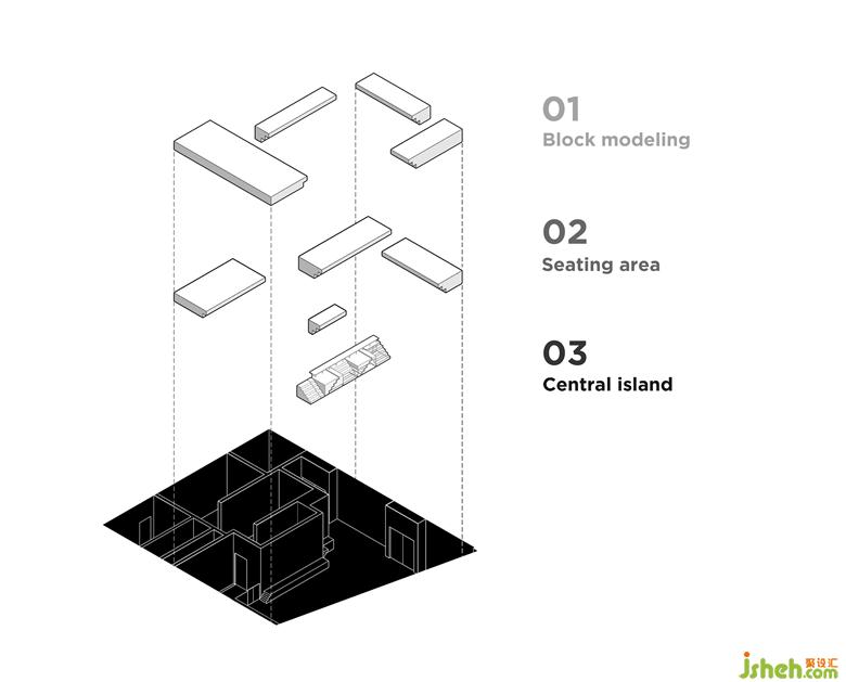 From outside in, the blocks are piling up and taking shape and the central island becomes a complex functional body, both of which are meant to arouse a cordial feeling.