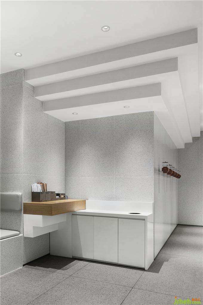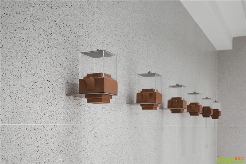 ▼ 茶具以傳統(tǒng)的陶土為器身,壺蓋則以透明亞克力制成,底部臺階狀的形式便于固定于墻面。奶茶店設(shè)計