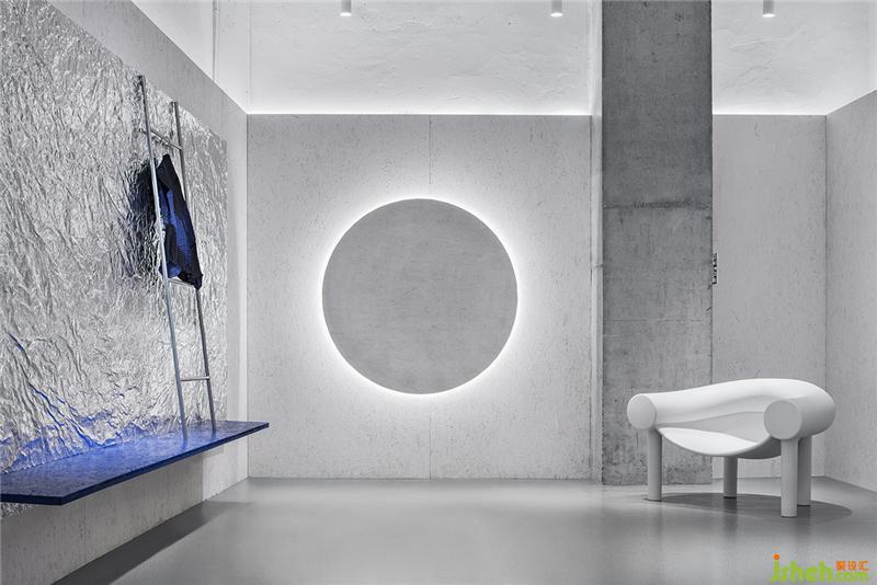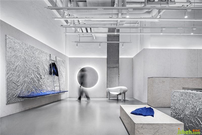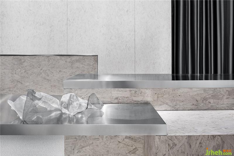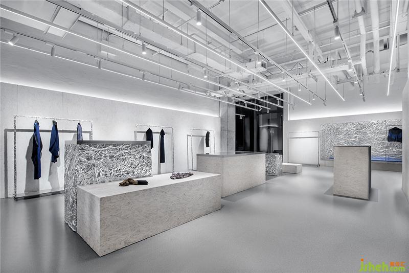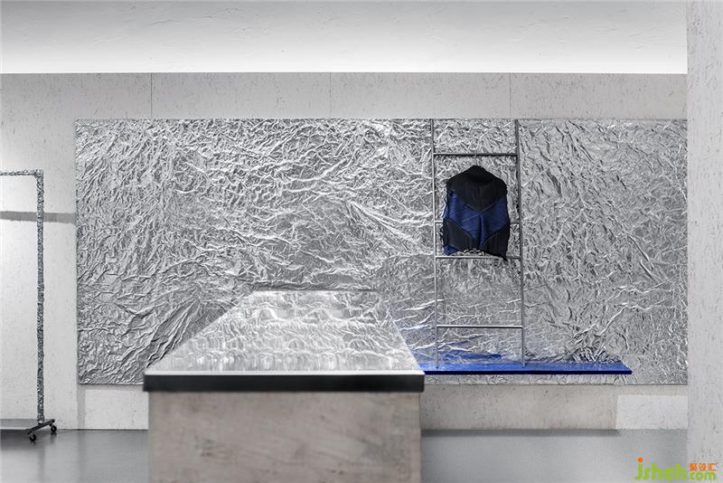 錫紙被揉皺后又鋪展開,人為制造出隨機的肌理和材質(zhì)本身的金屬質(zhì)感回應了服裝面料的工藝和光澤感,又與啞光的乳白色刨花板產(chǎn)生對比。這些材料加強了人們對于品牌核心面料的感受,成為品牌印象的一部分。服裝店設計