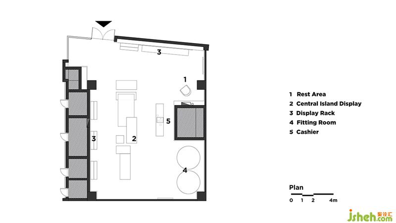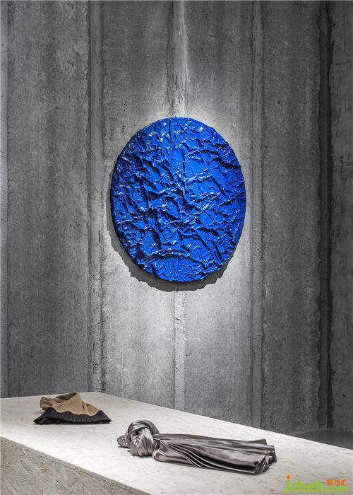 ▼ 墻面的藝術(shù)品以揉皺的錫紙結(jié)合品牌色制成,與展示的產(chǎn)品產(chǎn)生聯(lián)系與呼應(yīng)。服裝店設(shè)計(jì)