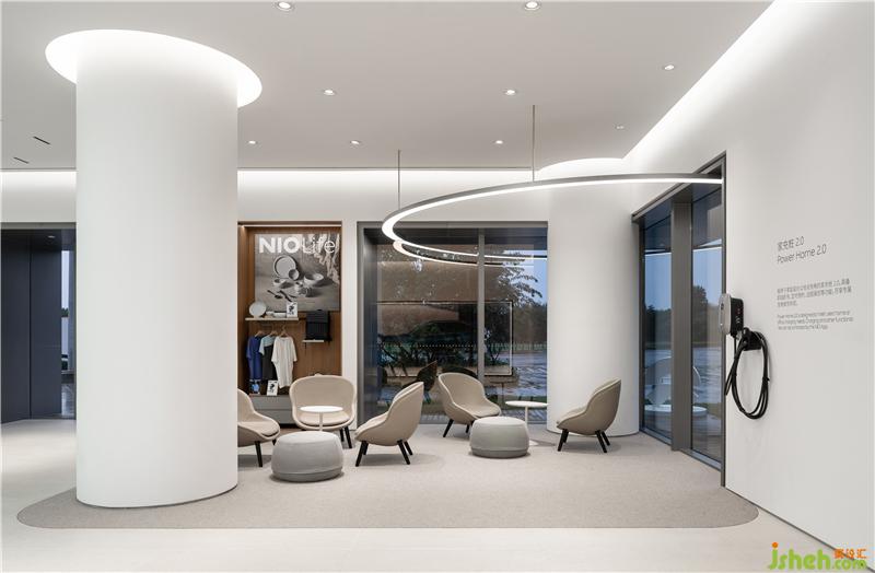 利用空間中兩個承重柱之間的范圍鋪敘休閑洽談區(qū),巧妙地營造了或隱或現(xiàn)的交流場景。洽談區(qū)位于轉(zhuǎn)角櫥窗處,NIO LIFE 展示區(qū)則被規(guī)劃在靠近櫥窗一側(cè),該區(qū)域通過貫通室內(nèi)外的圓環(huán)燈自然的將顧客的目光引向室外,戶外鋪設(shè)的木地板和草坪為整個空間引入自然舒適的氣息,消解了傳統(tǒng)汽車銷售展廳冰冷的氣質(zhì),為用戶提供一個溫暖而閑適的休閑場景。